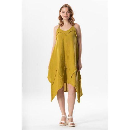 Askılı V Yaka Leyla Asimetrik Kesim Midi Boy Müslin Yazlık Elbise Yağ Yeşili Ygysl