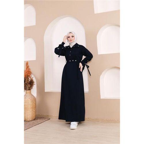 Belden Bağlamalı Çıtçıtlı Kol Şerit Detaylı Uzun Elbise - 71183.015 - Lacivert