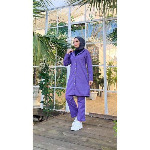 Çıtçıtlı Kapşonlu Uzun Tunik Pantolon İkili Tesettür Eşofman Takımı - 03078.207 - Koyu Lila