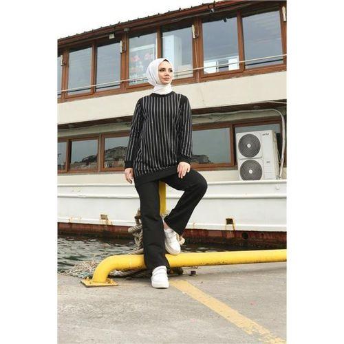 Çizgili Taş Desenli O Yaka İkili Tesettür Eşofman Takımı - 71187.003 - Siyah