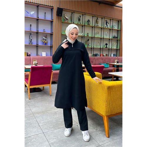 Dik Yaka Kısa Fermuarlı Yırtmaçlı Sade Basic Uzun Tunik ve Pantolon İkili Spor Takım - 03062.003 - Siyah
