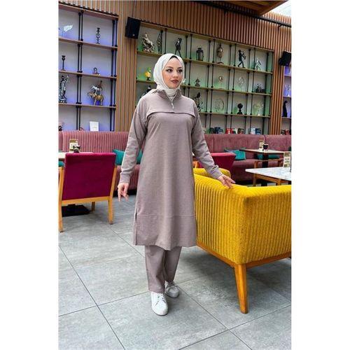 Dik Yaka Kısa Fermuarlı Yırtmaçlı Sade Basic Uzun Tunik ve Pantolon İkili Spor Takım - 03062.016 - Vizon