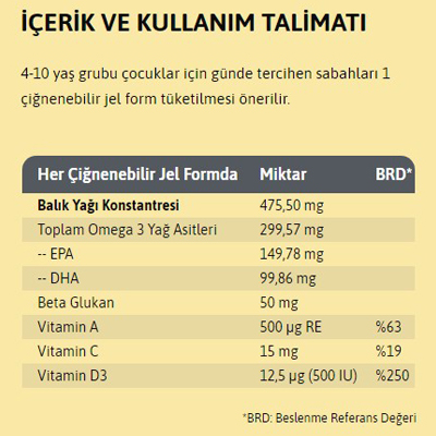 - 4-10 yaş grubu çocuklar için günde tercihen sabahları 1 çiğnenebilir jel form tüketilmesi önerilir.