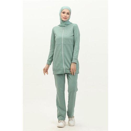Fermuarlı İnci ve Taş Detaylı İkili Sade Basic Eşofman Spor Takımı - 03038.100 - Çağla Yeşili
