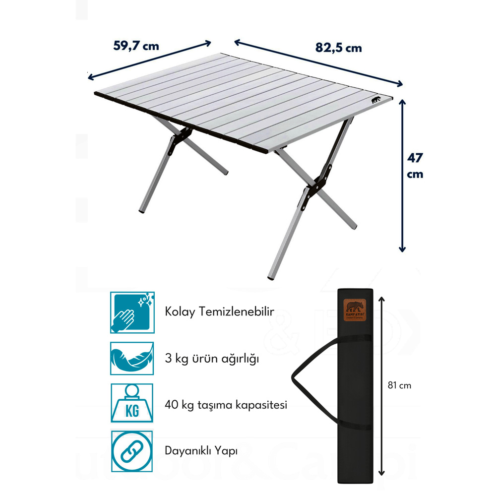 Tamamı alüminyum alaşımdan üretilen gövde ve masa tablası, hafiflik ile sağlamlığı bir arada sunar. Suya ve hava koşullarına dayanıklı yüzeyi kolay temizlenir ve uzun ömürlü kullanım sağlar.
