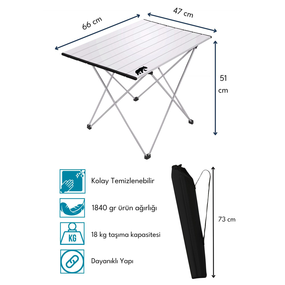 Kamp Ayısı® Orta Boy Alüminyum Katlanabilir Kamp ve Piknik Masası, Çantalı, Gri