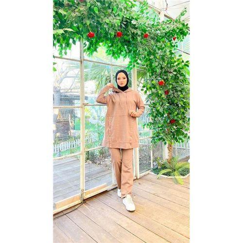 Kapşonlu Çıtçıt Detaylı Kısa Sweat Pantolon İkili Tesettür Eşofman Takımı - 03079.016 - Vizon