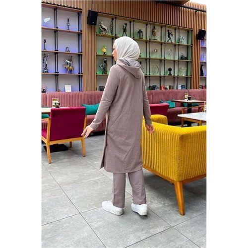 Kapşonlu Yandat Çıtçıtlı Sade Basic Uzun Tunik ve Pantolon İkili Spor Takım - 03071.016 - Vizon