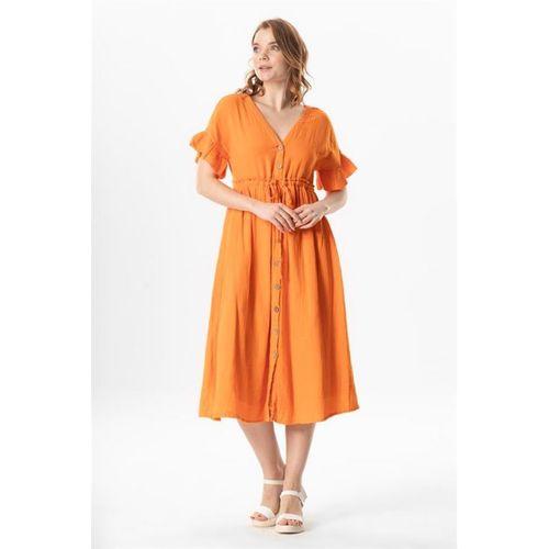 Kısa Kol Büzgülü Afra Midi Boy Yazlık Müslin Elbise Turuncu Trnc