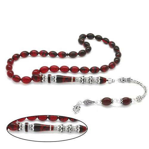 nipora Nipora 925 Ayar Gümüş Püsküllü Gümüş Minare Nakkaş İmameli Süzme Kırmızı-Siyah Ateş Kehribar Tesbih
