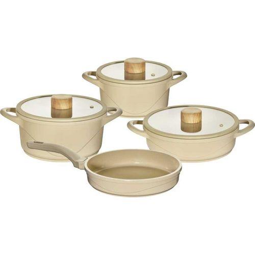 Oms Oyster Biogranit Seramik 7 Parça Tencere Seti Krem Gövde Ahşap Detay 12050