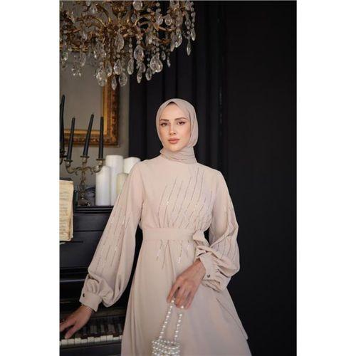 Taş Desenli Belden Bağlamalı Uzun Elbise - 71197.026 - Bej
