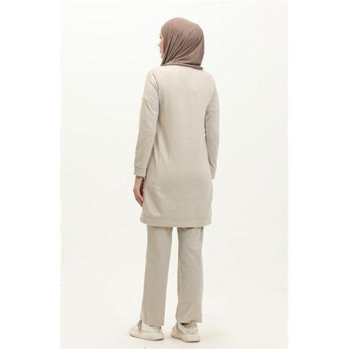 Taşlı Çizgi Desenli Bisiklet Yaka Uzun Tunik Sade Basic Eşofman Spor Takımı - 03048.027 - Ekru