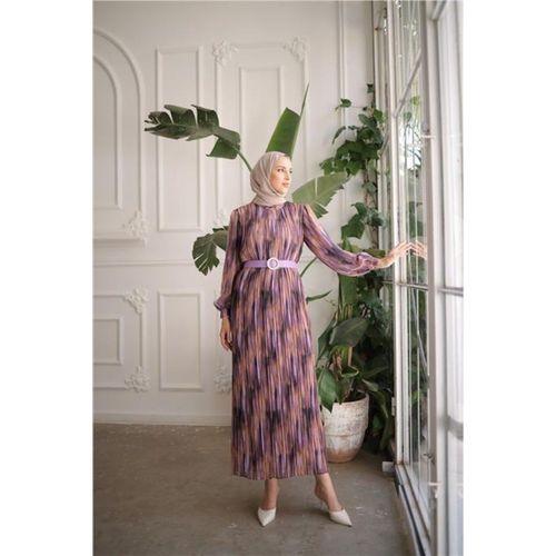 Toka Kemerli Uzun Çizgi Desenli Şifon Elbise - 50008.013 - Mor