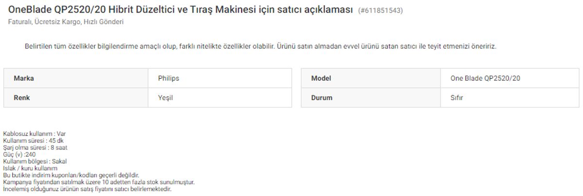 OnlineSatış OneBlade QP2520/20 Hibrit Düzeltici ve Tıraş Makinesi için satıcı açıklaması